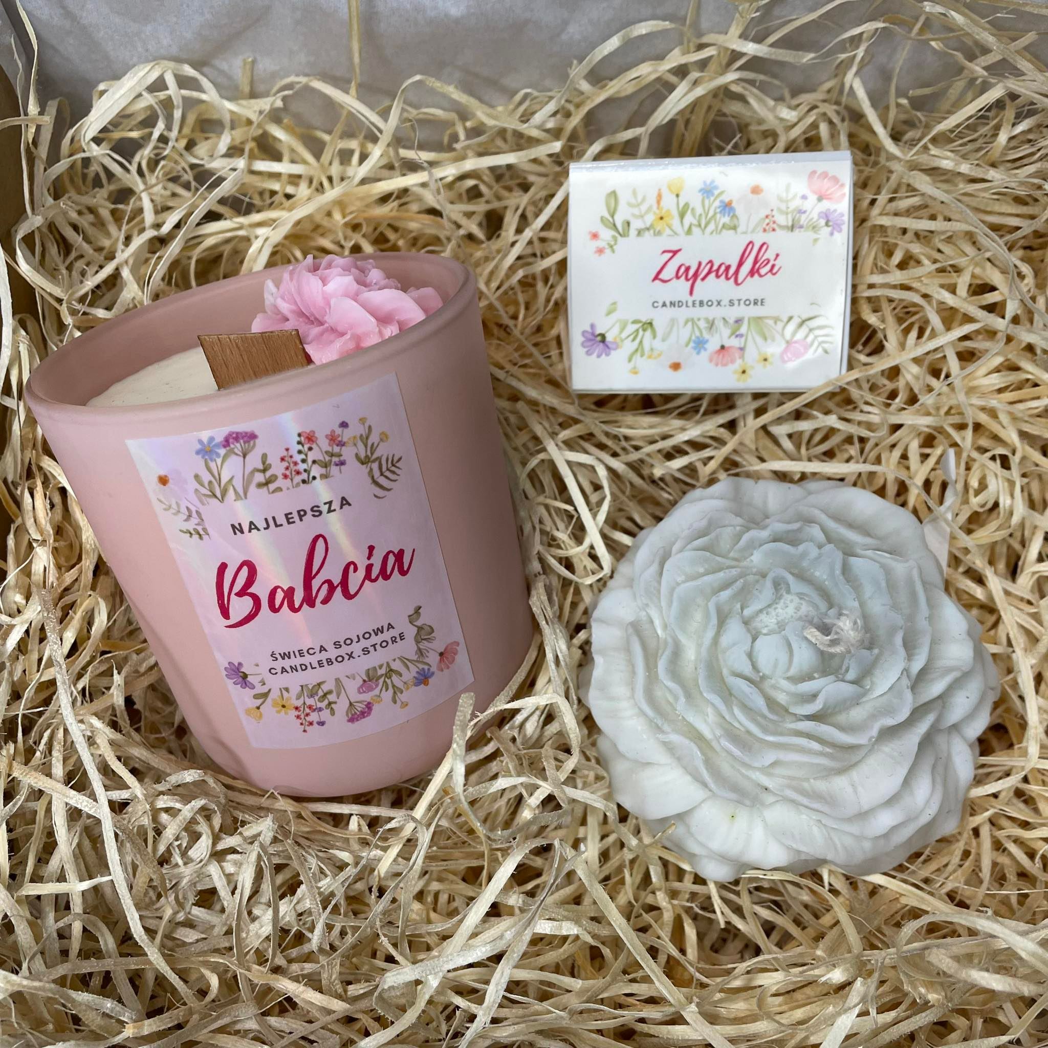 Duet świec, zapakowany i gotowy na prezent: świeca w szkle, do wyboru biała, czarna, lub różowa, z dowolną etykietą, złota, drewniana lub srebrna zakrętka, Świeca sojowa w formie, do wyboru: piwonia, kobieta z kwiatami na oczach, kobieta z kwiatami we włosach, bubble, kłębek, możliwość wyboru i dowolnej personalizacji etykiety.