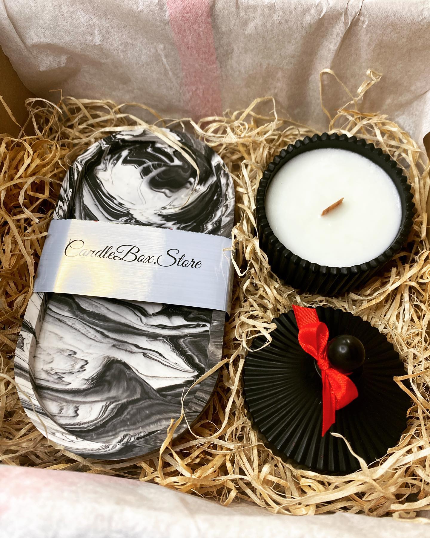 Świeca w pojemniku z gipsu polimerowego z pokrywką, w zestawie z owalną podstawką. Dowolny kolor i stylistyka, możliwość dodania złoceń/srebrzeń, marmurek, lastryko, jednokolorowe, dwukolorowe itd.