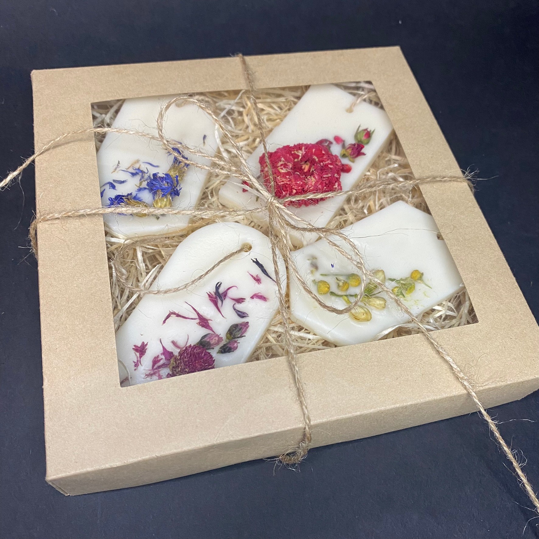 Ręcznie wykonane zawieszki zapachowe z wosku sojowego, z dodatkiem suszonych kwiatów naturalnych. Które idealnie sprawdzą się jako ozdoba w domu, zawieszka zapachowa do szafy, samochodu itp. Mix zapachów, do wyboru kwiatowe, owocowe, lub dowolnym innym na zamówienie. W pełni wykonane z naturalnych składników. W kartoniku z okienkiem, przewiązane jutowym sznureczkiem. Zawieszki mogą posłużyć także jako wosk do podgrzewacza zapachowego.
